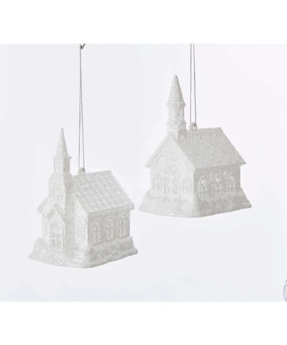 Set of 2 White Glitter Church Lighted LED Ornaments T2166
