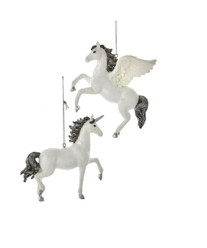Set of 2 Silver and White Unicorn and Pegasus Ornaments E0658