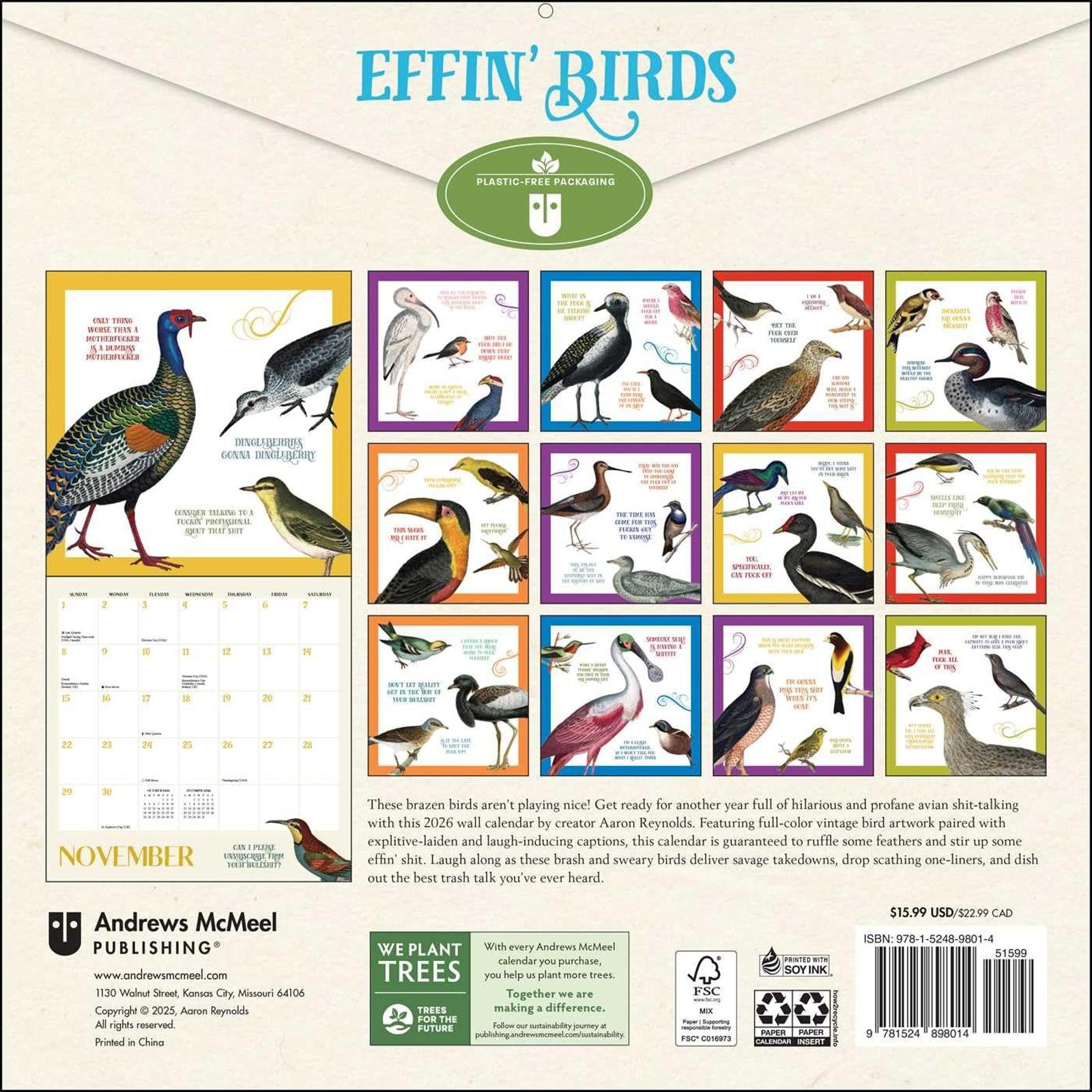 Each monthly spread features vintage bird artwork paired with sweary sayings
