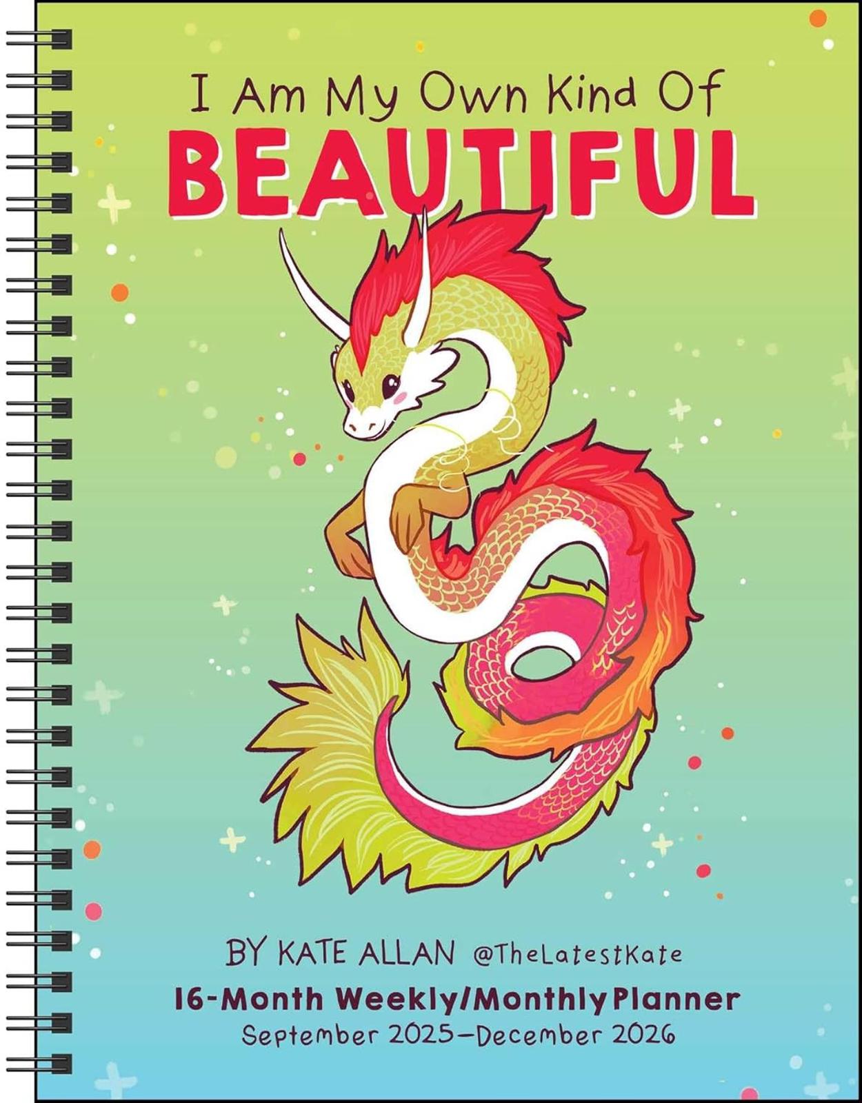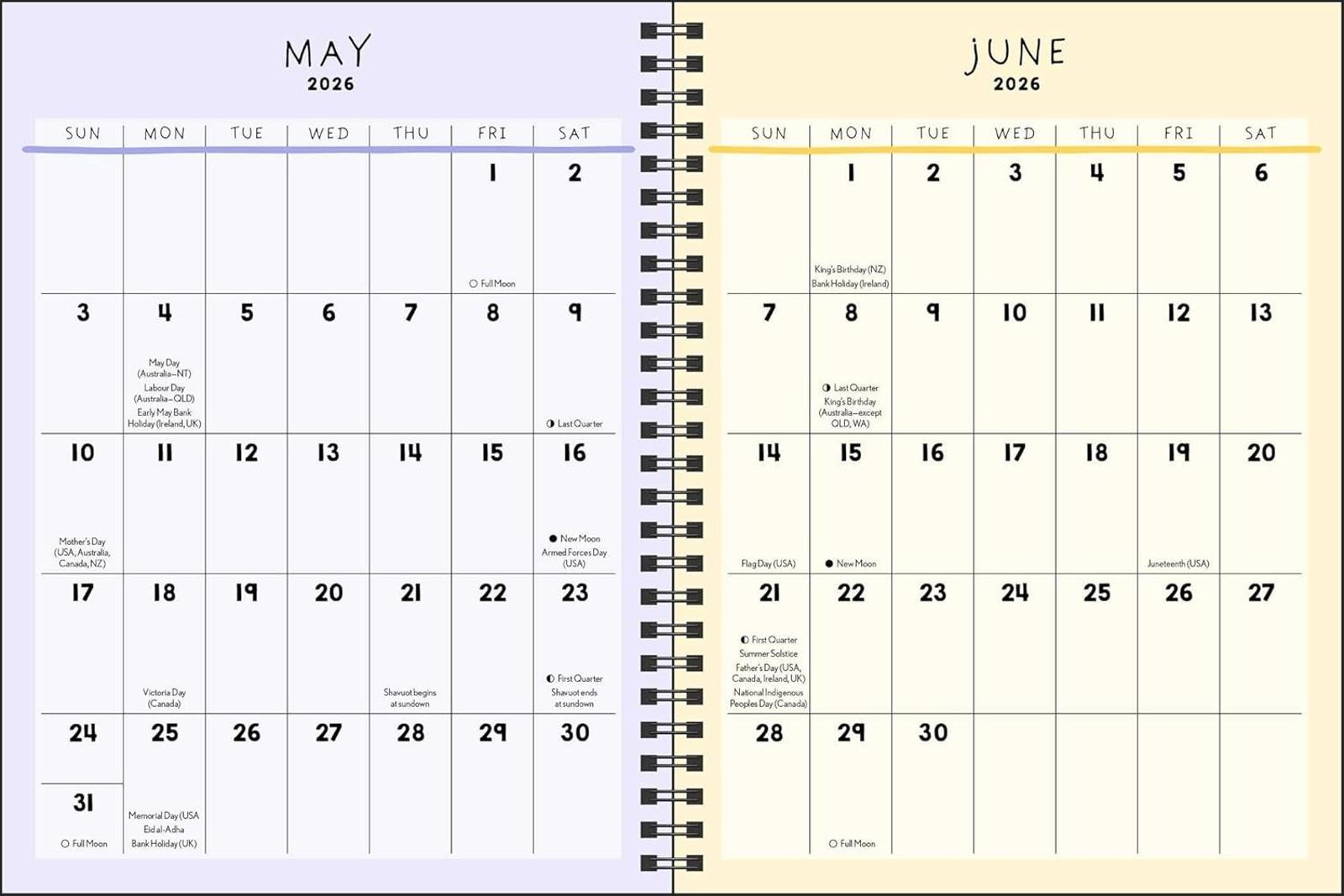 Weekly spreads have space for 7 days, plus artwork and months-at-a-glance reference