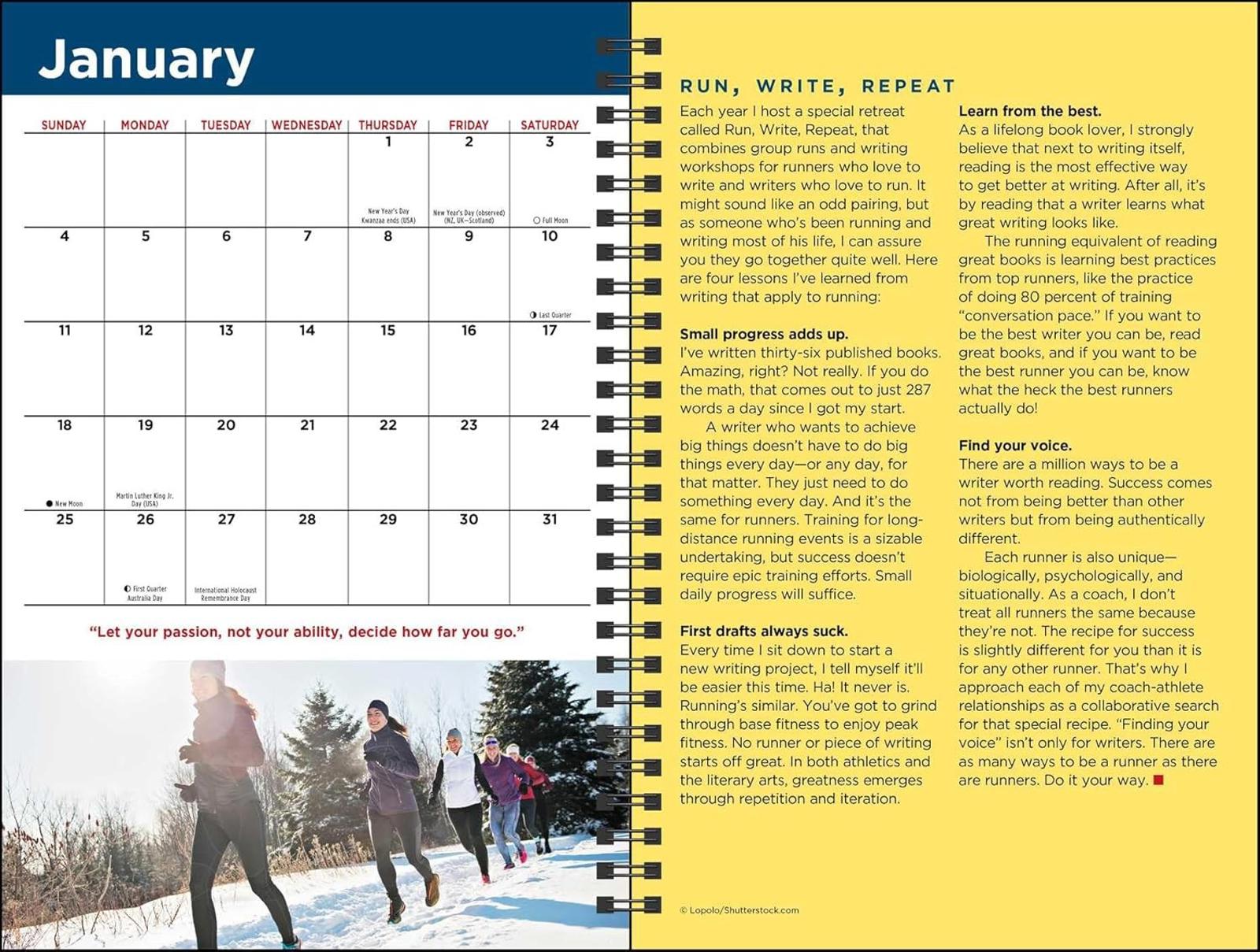 Features include:• Page size: 6.6" x 9.4" (13.2" x 9.4" open)• Spiral bound• Sturdy soft cover• Calendar lays flat when open• Printed on FSC® certified paper with soy-based ink• 12-month planner: January–December 2026• Generous grid space for notes, appointments, and reminders• Monthly and weekly planning pages• Space to add your own lists, goals, and important dates• Extra pages at back for notes, goals, and more• Year-at-a-glance pages for 2024, 2025, and 2026• Official major world holidays and observances• Each month features color photography plus an insightful original essay and weekly tips from running coach Matt Fitzgerald, with a year-end customizable three-week race-prep timeline, DIY cumulative-mileage graph, and space to record race results.