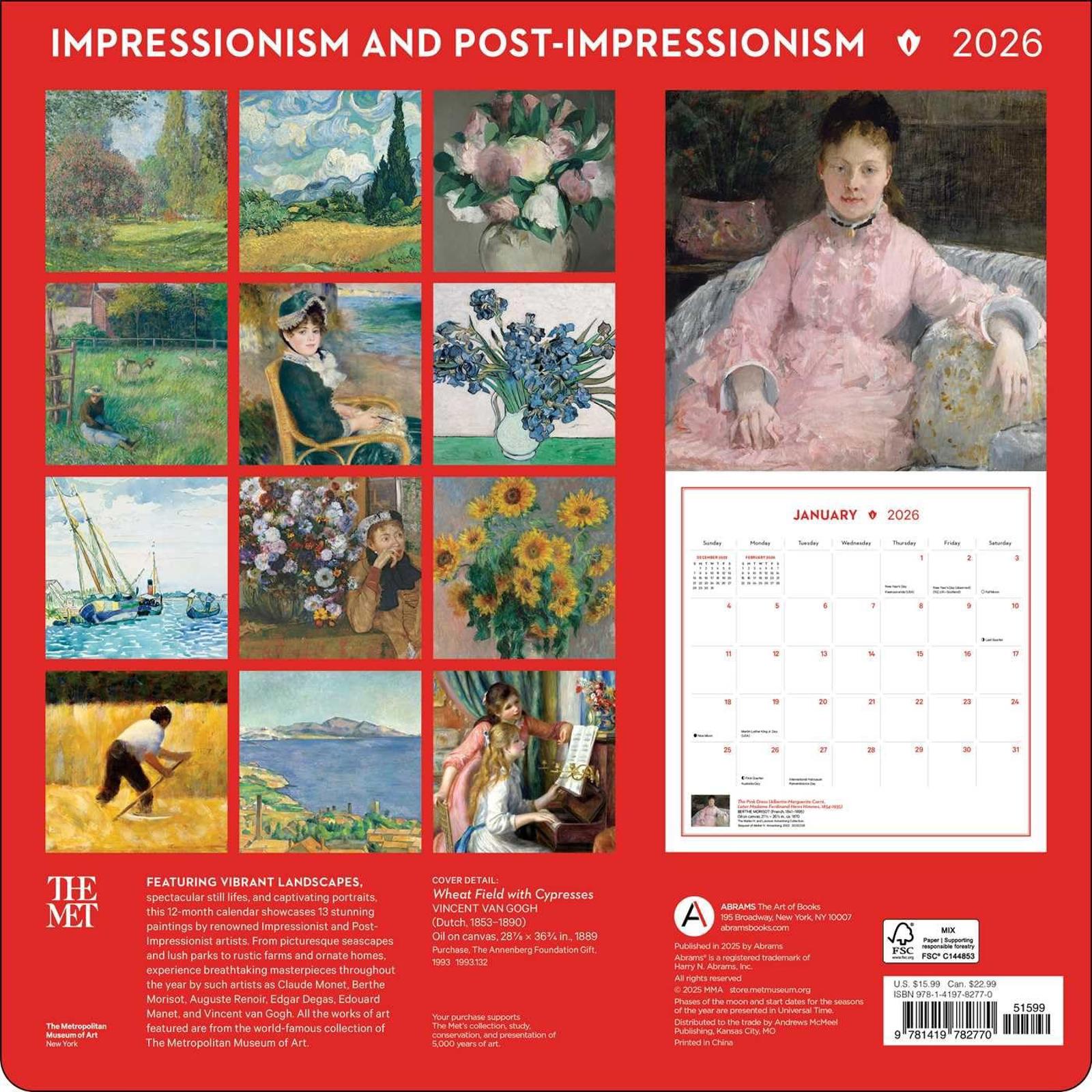 Enjoy 13 stunning paintings by Impressionist and Post-Impressionist masters with this 12-month calendar from The Metropolitan Museum of Art.From landscapes and seascapes to still lifes and portraits, this 12-month calendar highlights 13 vibrant paintings by renowned Impressionist and Post-Impressionist artists, including Vincent van Gogh, Claude Monet, Berthe Morisot, Camille Pissarro, and Auguste Renoir. Throughout the year, journey from Paris to Provence and take pleasure in these breathtaking masterpieces. All of the works of art featured are from the world-famous collection of The Metropolitan Museum of Art.Features include: