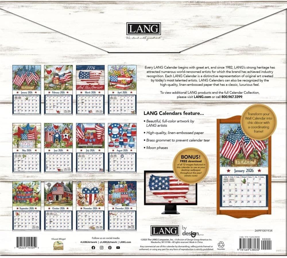 - Patriotic artwork ? monthly American patriotic illustrations for inspiration and national pride. - Wall format ? large grid sizes for easy scheduling and clear monthly organization. - Ideal size ? measures 13.4" x 12" closed, expanding to 13.4" x 24" when open for prominent display. - Stapled binding ? high-quality linen-embossed paper with brass grommet for durability throughout the year. - Full coverage ? 12-month Standard calendar starting 1/1/2026 with major U.S. holidays and mo