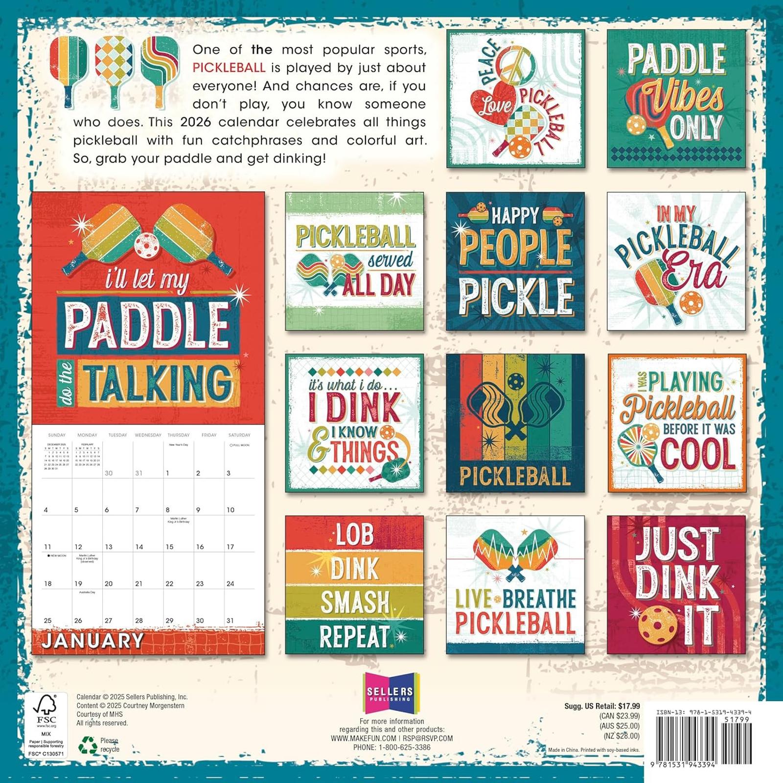 Keep your paddle up! Fun sayings make this new calendar perfect for thepickleball enthusiast. Pickleball is one of the fastest growing sports in America,and is played by just about everyone! Celebrate all things pickleball with fun catchphrases and colorful art. So, grab your paddle and get dinking!