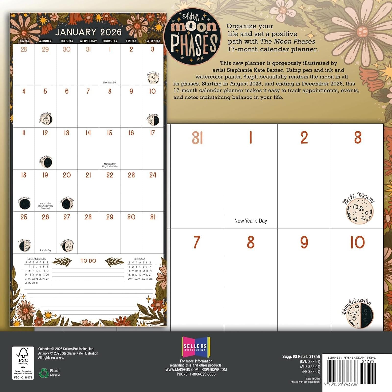This new wall planner is gorgeously illustrated by artist Stephanie Kate Baxter. Using pen and ink and watercolor paints, Steph beautifully renders the moon in all its phases. Delightful florals have been added to enhance a large grid that makes it easy to keep track of appointments and events. We offer two other calendars from Stephanie: The Natural World wall calendar, and Strawberry Fields weekly calendar.