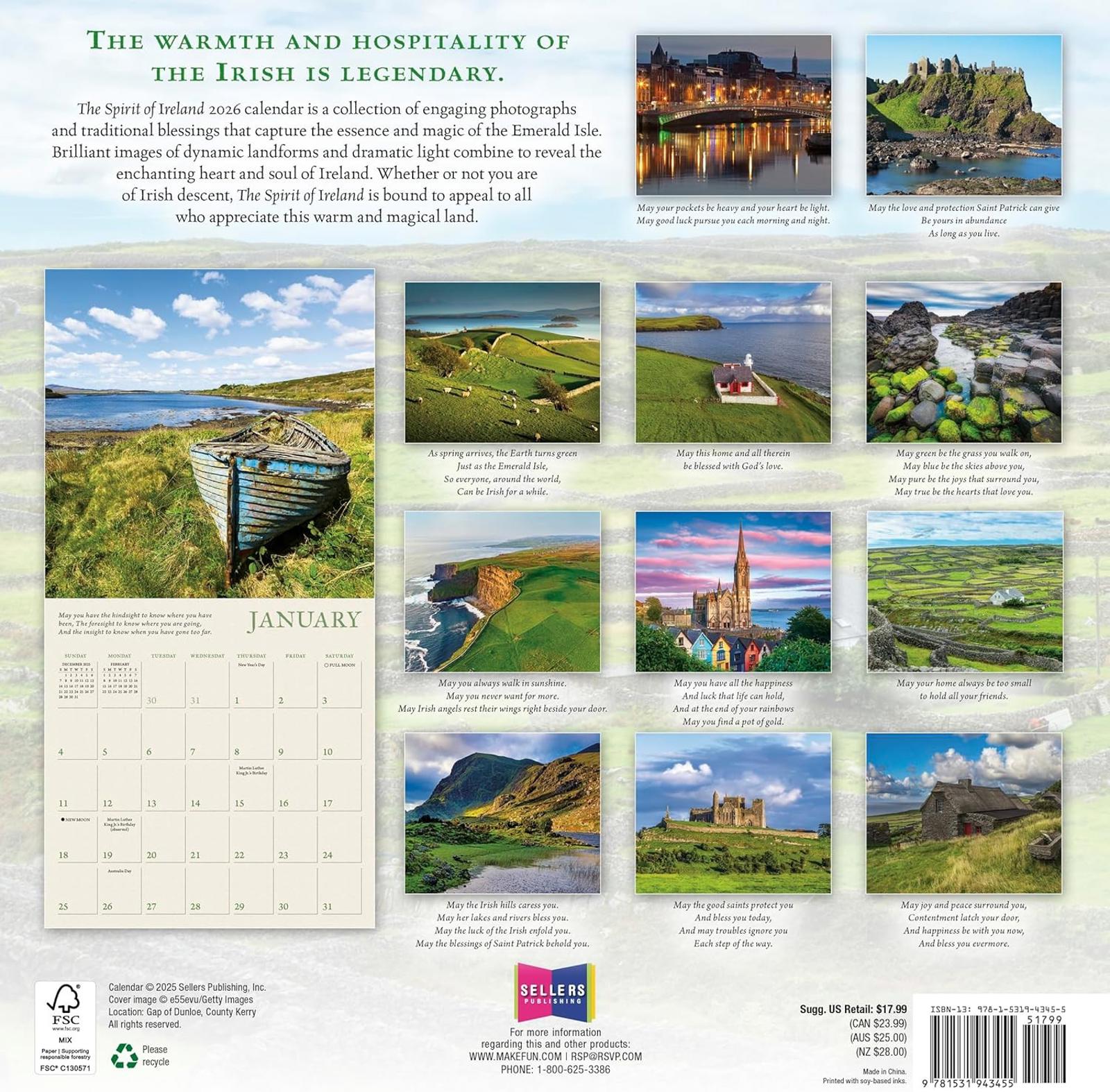 This beautiful calendar is a collection of engaging photographs and traditional blessings that capture the essence and magic of the Emerald Isle. Luminous images of dynamic landforms and dramatic light combine to reveal the enchanting heart and spirit of Ireland. A favorite among the millions of people with connections to the Emerald Isle.