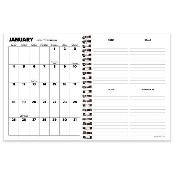 All you need is love and a Beatles planner! Measuring 6.5" (w) x 8" (h), this officially licensed all-encompassing medium planner, boasts monthly, 2-page spreads that include lined sections for notes, tasks, and goals and weekly, 2-page spreads with lined daily sections to keep plans neat and organized, plus a dedicated weekly priorities section to help keep you focused. The interior pages are designed with a clean and refined feel, accented with faux monthly tabs for easy access to weekly planning. Enhance your daily plans with 216 color coordinating stickers to highlight special occasions and personalize your planner. Bonus lined notes pages are in the back with yearly 2026 and 2027 views in the front. Featuring the Fab Four on the cover and black wire-o binding designed to lay flat when open, this 12-month planner covers January 2026 – December 2026 and contains no plastic. Printed on FSC-certified paper.