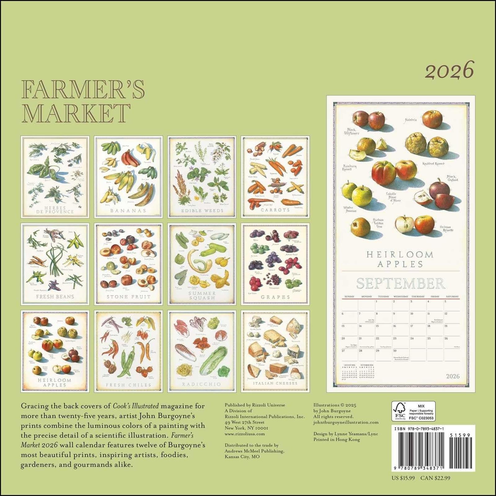 John Burgoyne's gorgeously detailed illustrations will inspire cooks, foodies, kitchen gardeners, and the millions who recognize the prints from Cook's Illustrated magazine.Each month of Farmer's Market 2026 Wall Calendar features exquisitely detailed and hand-colored renderings of seasonal produce, such as cherries, eggplants, and winter squash; herbs and spices, such as basil and grilling spices; or delectable artisan foods found at greenmarkets across the country, such as chocolate and holiday breads.