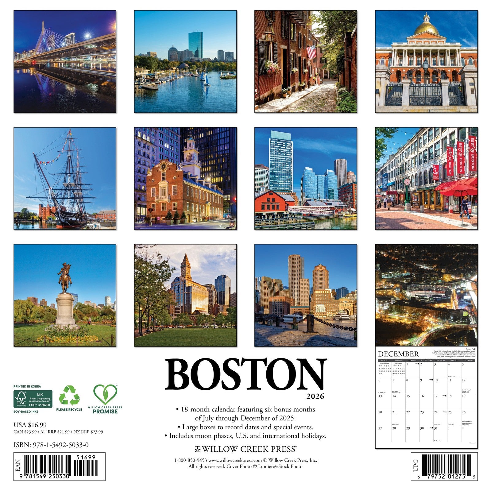 HISTORICALLY CHARMING – Explore the vibrant neighborhoods, iconic landmarks, and rich history of Boston through twelve captivating images in this 2026 wall calendar. From cobblestone streets to modern skylines, each month celebrates the unique spirit of the city..