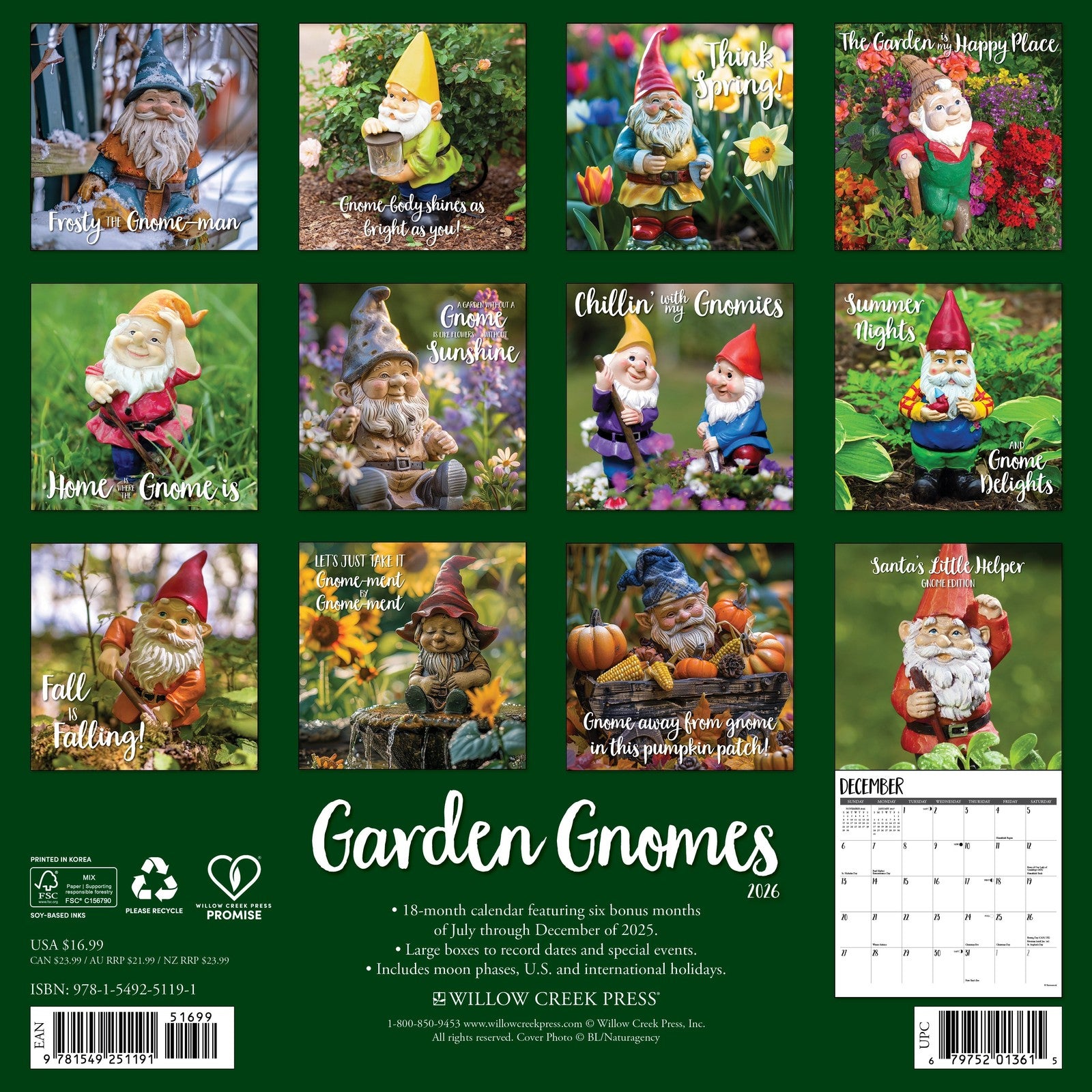GNOME PLACE LIKE HOME – Create a haven of gnome-inspired joy with the 2026 Garden Gnomes 12" x 12" Wall Calendar. Each month, this charming calendar unveils a new scene featuring mischievous beings in pointy hats, adding a touch of folklore to your wall. Whether nestled among flowers, perched on toadstools, or hidden in greenery, the spirit of garden gnomes will infuse your space with prosperity and harmony in the new year.