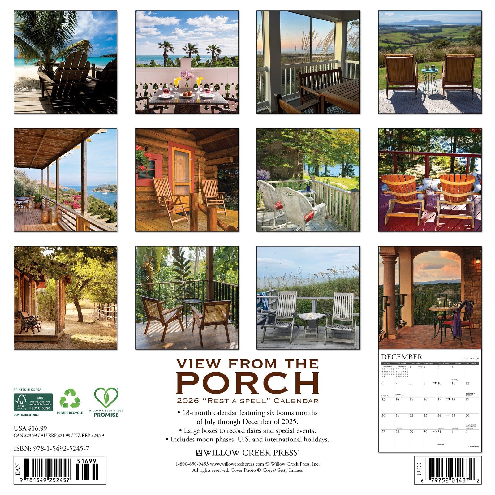 COZY ESCAPES – Bask in the serenity of scenic views and inviting porches from across the globe in this charming 2026 wall calendar. Each month offers a peaceful reminder to slow down, relax, and enjoy the beauty of a perfect porch moment.